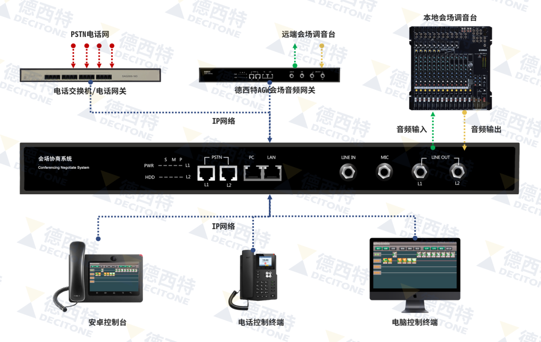 德西特CNS2016会场协商系统兼容标准化SIP协议,具有强大的混音能力。可以与视频会议接通、与电话网络接通、与其它会议室音响系统接通、配合专业网设备,还可以将对讲机音频接入会商现场。