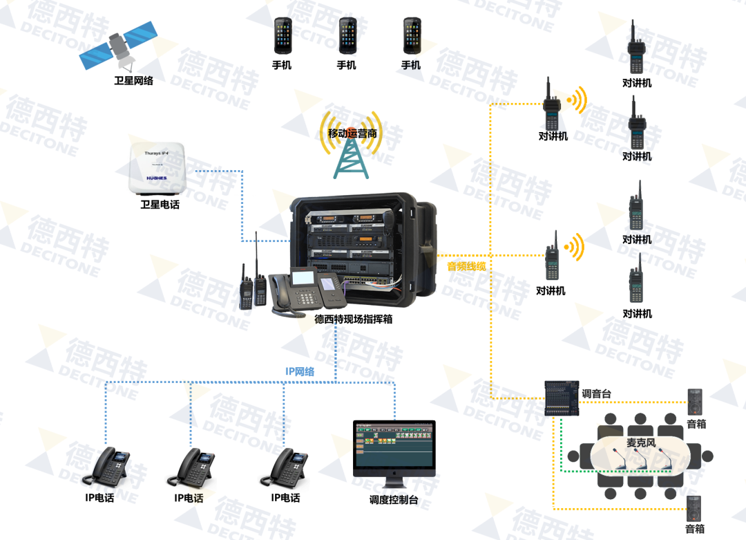 德西特现场应急指挥系统是专门为现场应急场景设计,以保障现场语音应急为主要设计思路。融合多种通信手段。可以实现现场多部门、多种制式集群对讲机(PDT350M/TETRA800M/POC/DMR等)、公网对讲机的互联互通。并整合卫星电话、移动电话、IP电话、音响麦克风等装备,实现多种通信手段在现场应急时的保障需求。同时,可以快速组织不同通信手段的多方通话,不断话的情况下,各种通话组灵活切换。专门为现场应急指挥环境设计。