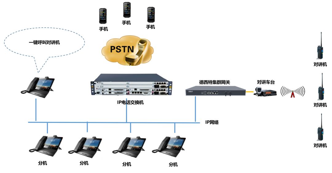德西特集群对讲网关将对讲机与数据中心电话系统打通。在数据中心内配置对讲机,数据中心办公区人员可以使用桌面电话直接呼叫数据中心内的对讲机。同是,数据中心内的对讲机可以谁说呼叫办公室的桌面电话。
