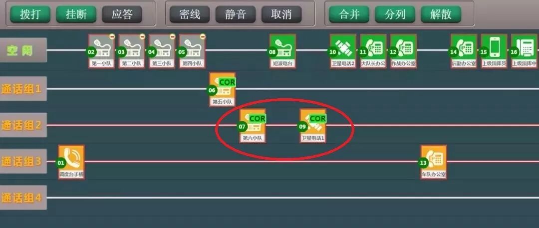 当不同指挥员在不同的通话组进行会商讨论时,上级指挥体系要临时组建密线通话,现场指挥操作员可以将不同通话组内的人员纳入到同一个密线通话组,组外人员无法收听组内通话内容。