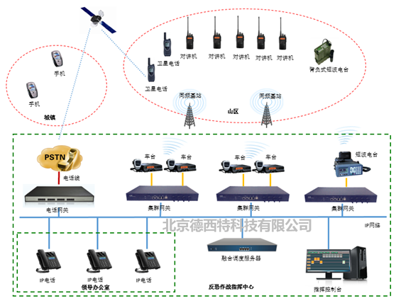 本方案采用北京德西特科技有限公司研发生产的应急指挥调度系统,突出应急特性,多种通讯手段相互融合,实现快速跨平台的应急调度指挥应用,极大的提高了作战效率,将对讲机、电话、短波电台、卫星电话全部融合接入指挥系统,波索指挥中心可以方便的掌握行动的情况,及时作出反应,协调各各小队进行有效的配合和支援。系统建成后将极大的提高边境地区的反恐边防部队的作战能力。